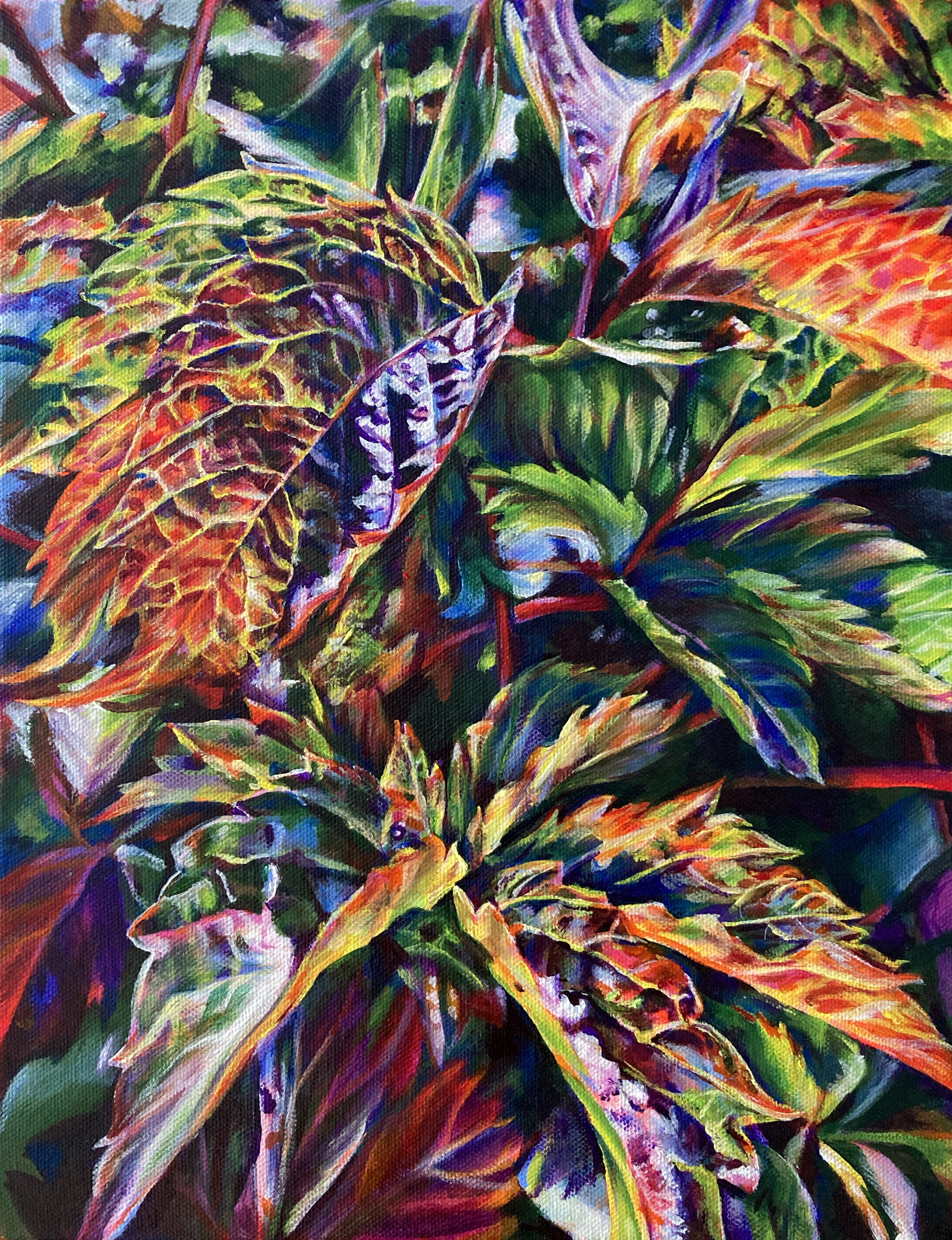 With this series, I wanted to explore the wide spectrum of colors that come out of these leaves in the fall. For each painting, I start with a different base color and let that base influence the color decisions I make through the process. The result is that each piece has a very distinctive mood and energy. Each one is named with the color starting point.